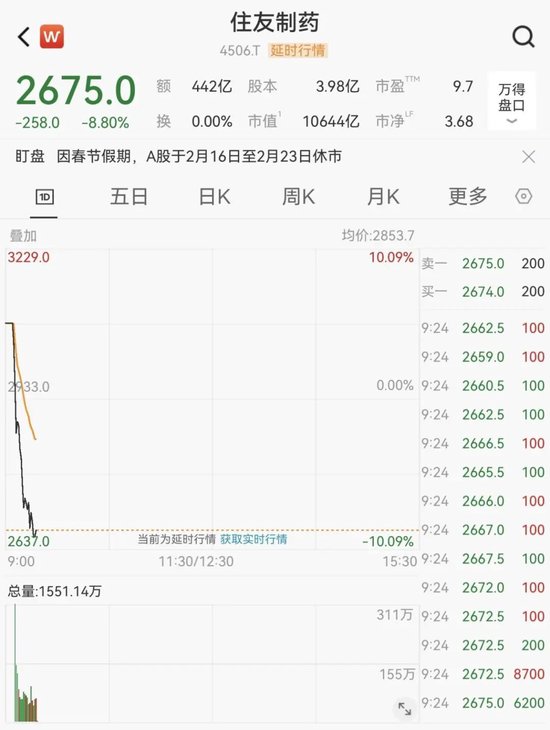 住友制药一度大跌超10%