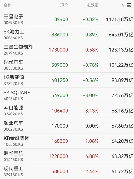 权重股方面,三星电子、SK海力士、现代汽车等震荡调整,斗山能源、韩华宇航、现代重工等震荡拉升。