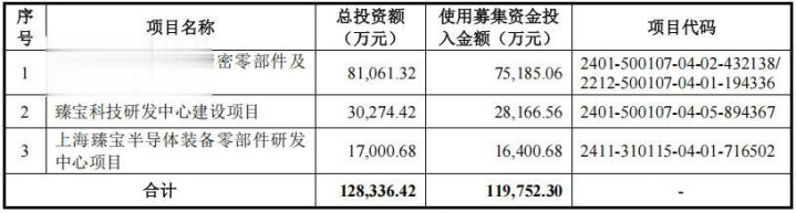 本次IPO,臻宝科技拟募集资金 11.98 亿元,主要投向集成电路和显示面板设备精密零部件及材料生产基地项目、臻宝科技研发中心建设项目和上海臻宝半导体装备零部件研发中心项目。