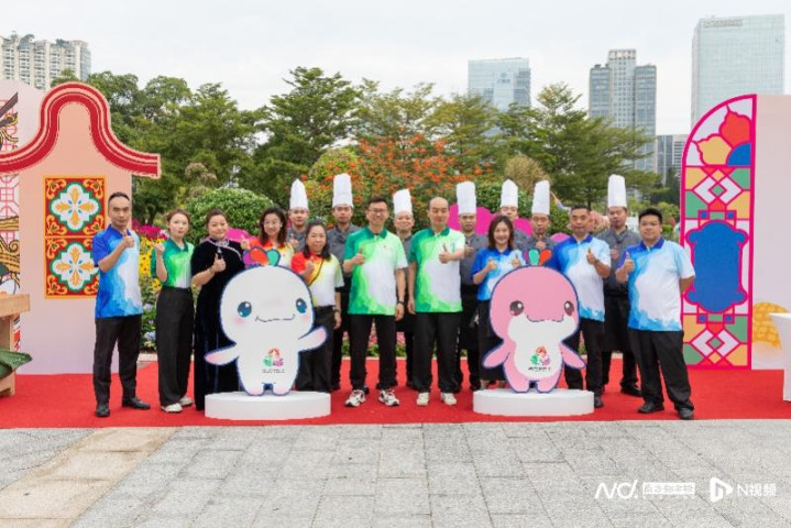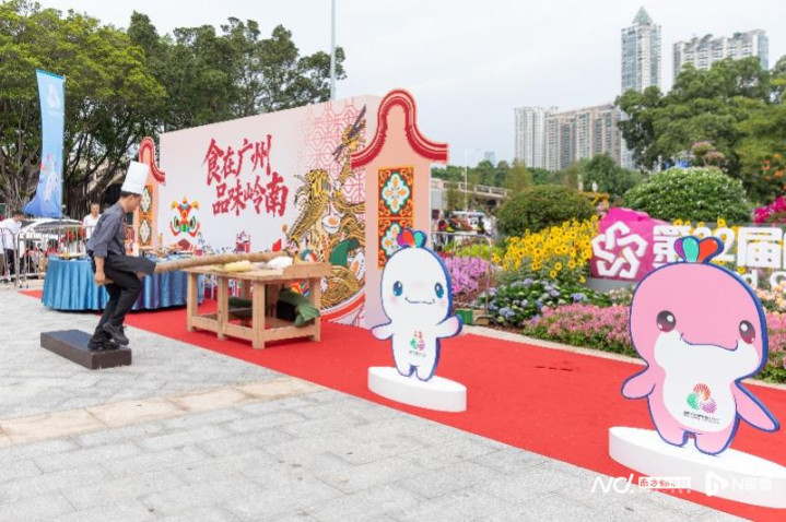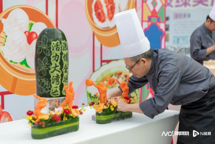 现场集中呈现多种粤式烹饪技艺,全方位展现广府美食魅力:师傅现场制作虾饺,传递广式“一盅两件”的悠闲精致;师傅托着红皮赤壮的烤乳猪,金红油亮的色泽,象征着体育事业的红火兴旺与运动员们的满腔热血;其作为“红袍加身”的隆重宴席主角,寄托了对参赛健儿金榜题名、勇创佳绩的美好祝愿;非遗竹升面的制作展示同样令人瞩目——师傅骑跨竹竿反复弹压,使面团松软劲道。瓜雕技艺更是巧夺天工,在冬瓜上刻出“激情全运会,活力大湾区”口号,配以粤港澳三地市花点缀,引人赞叹。